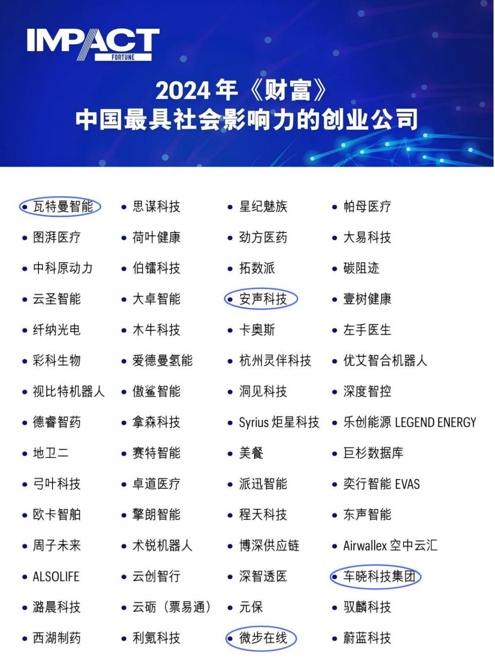 近日,全球著名商業(yè)雜志《財富》(Fortune Magazine)發(fā)布“2024年中國最具社會影響力的創(chuàng)業(yè)公司”榜單。創(chuàng)投集團4家被投企業(yè)成功上榜,包括:瓦特曼智能、安聲科技、微步在線和車曉科技。