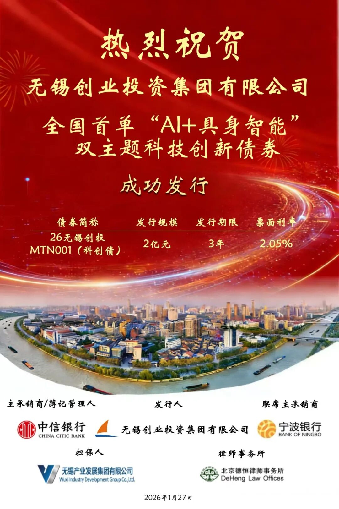 1月27日,全國(guó)首單同時(shí)聚焦“人工智能”與“具身智能”的主題科技創(chuàng)新債券在錫發(fā)行。無錫創(chuàng)業(yè)投資集團(tuán)有限公司成功發(fā)行2026年第一期中期票據(jù),規(guī)模2億元,集中投向人工智能與具身智能賽道。這是繼去年成功發(fā)行全國(guó)首批科技創(chuàng)新債券后,創(chuàng)投集團(tuán)再次運(yùn)用金融創(chuàng)新工具,精準(zhǔn)引導(dǎo)社會(huì)資本投向科技前沿,為無錫乃至長(zhǎng)三角地區(qū)關(guān)聯(lián)產(chǎn)業(yè)發(fā)展注入動(dòng)能。